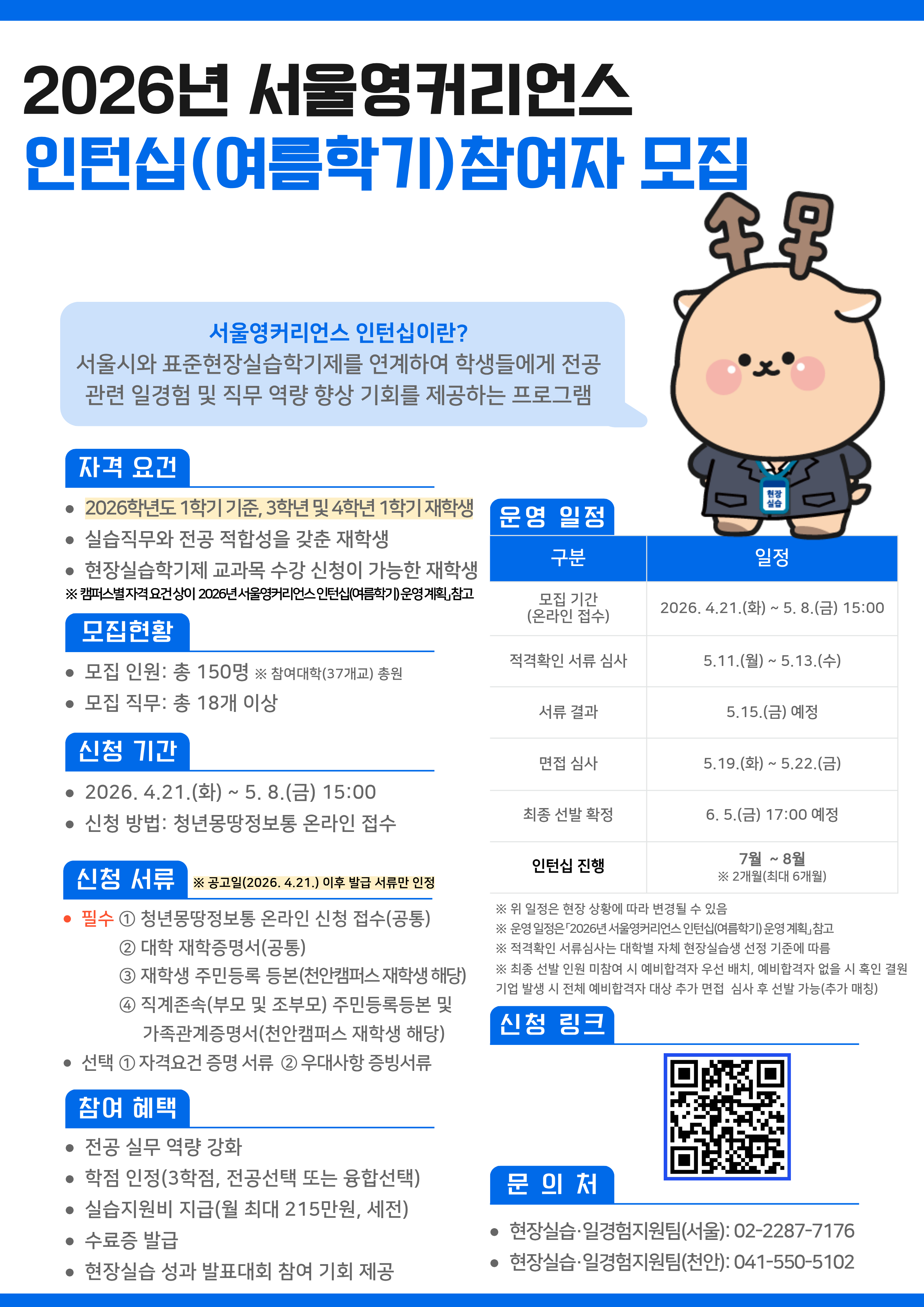 현장실습·일경험지원팀(서울)에서는 2026년 서울영커리언스 인턴십(여름학기) 참여자 모집을 아래와 같이 안내드리오니, 관심 있는 학생들의 많은 참여 바랍니다.